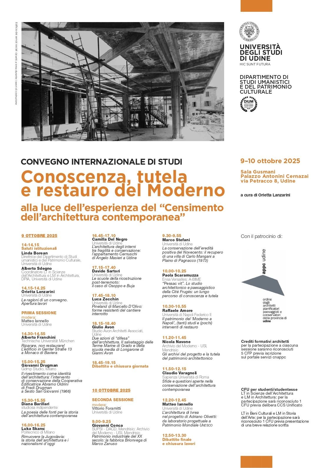 Nei giorni 9 e 10 ottobre 2025, presso la Sala Gusmani di Palazzo Antonini Cernazai di Udine (via Petracco, 8), si terrà il Convegno internazionale dal titolo: Conoscenza, tutela e restauro del Moderno alla luce dell'esperienza del “Censimento dell’architettura contemporanea" .