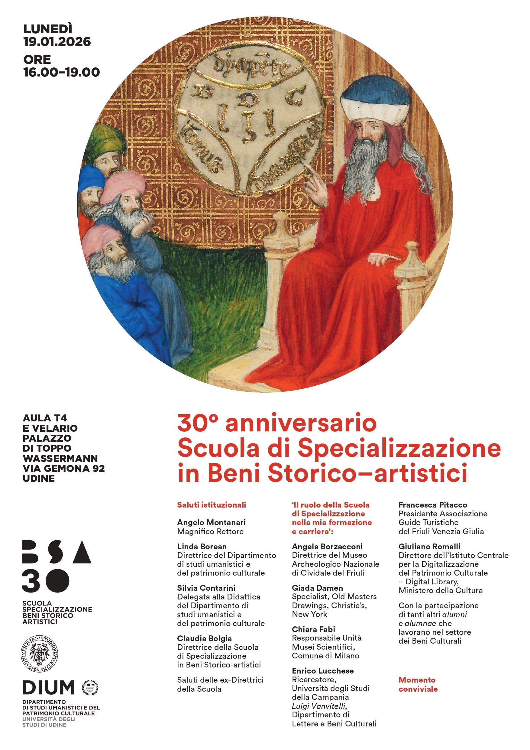 Lunedì 19 gennaio 2026, alle ore 16.00, nell'Aula T4 di Palazzo di Toppo Wassermann (via Gemona, 92 - Udine) si terrà la Celebrazione del Trentennale della Scuola di Specializzazione in Beni Storico-Artistici.