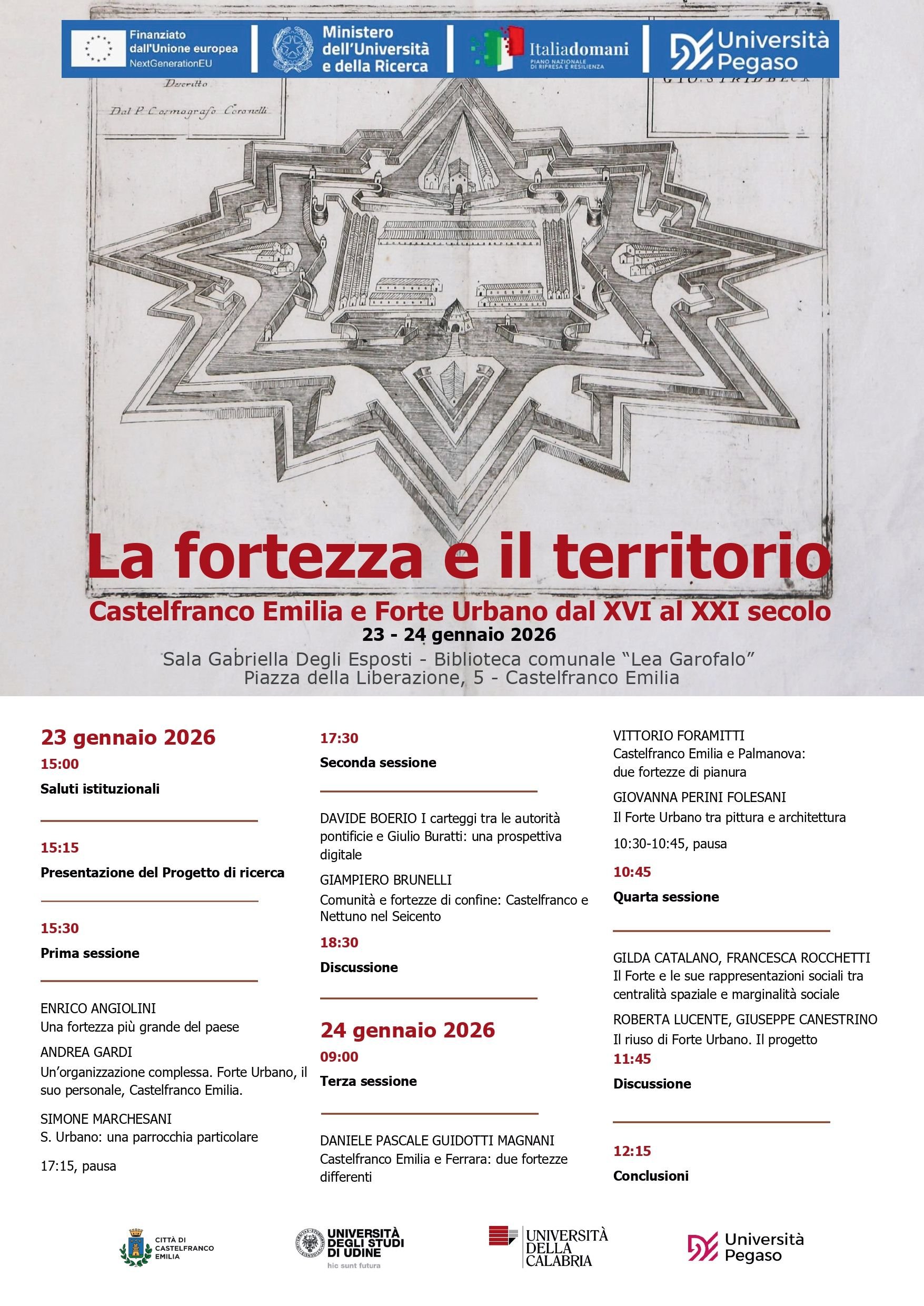 Nei giorni 23 e 24 gennaio 2026, a Castelfranco Emilia, nella Sala Gabriella Degli Esposti - Biblioteca comunale “Lea Garofalo”, si terrà il Convegno di studi sull’impatto delle fortezze del XVI e XVII secolo sui contesti territoriali in cui sorgono, a partire dal caso di studio di Forte Urbano presso Castelfranco Emilia, nel quadro del PRIN PNRR “Alla Moderna”: Fortresses for a Prototypical Early Modern State. The Bastion Forts of the Papal State of the Sixteenth and Seventeenth Centuries: New Urban Roles beyond Centre and Periphery.