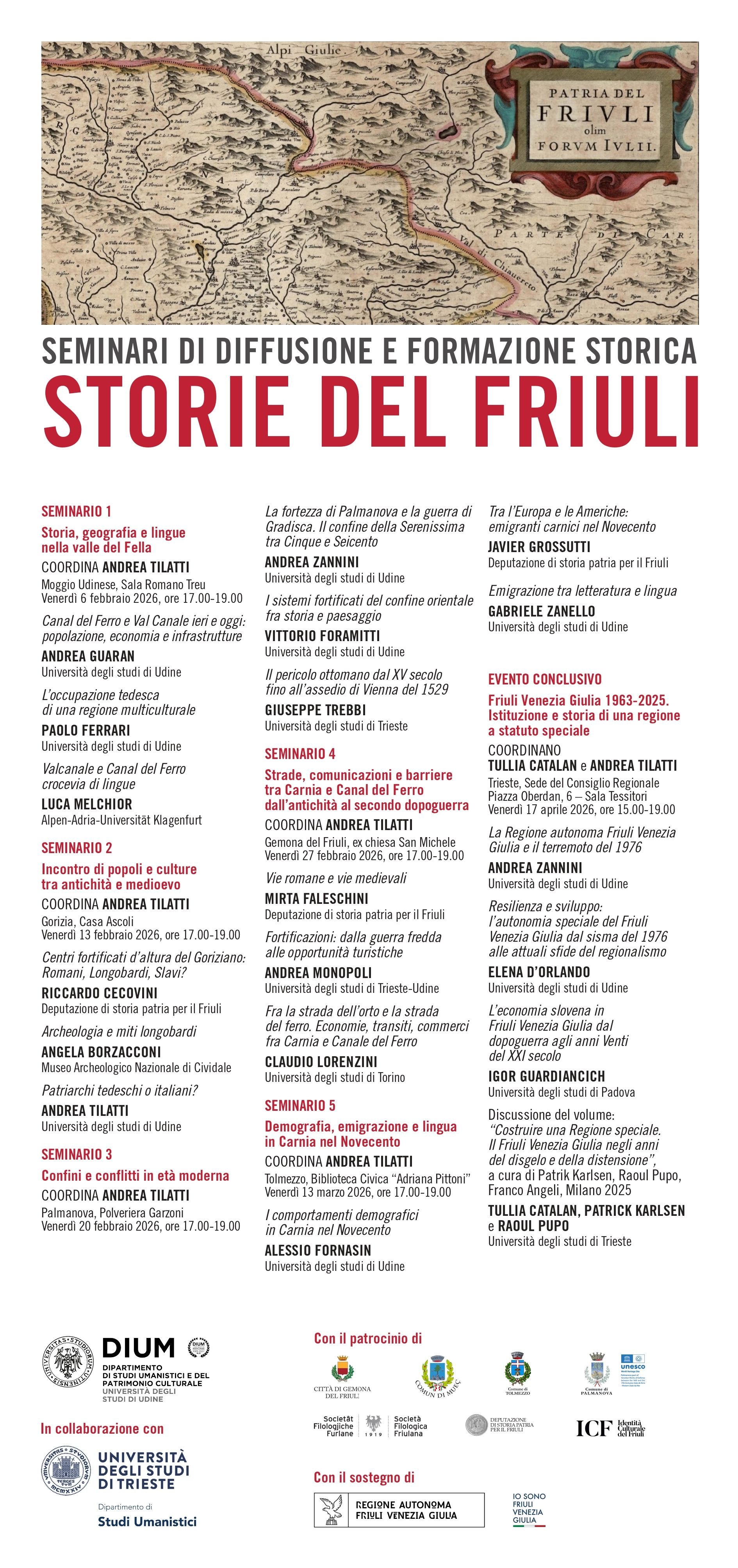 Dal 6 febbraio al 17 aprile 2026, patrocinati dalla Società Filologica Friulana, e promossi dal Dipartimento di Studi umanistici e del patrimonio culturale dell'Università degli Studi di Udine si svolgeranno i seminari di diffusione e formazione storica sulla "Storia del Friuli dall’antichità all’età contemporanea" dislocati in diverse località friulane (Moggio Udinese, Gorizia, Palmanova, Gemona del Friuli, Tolmezzo, Trieste).
