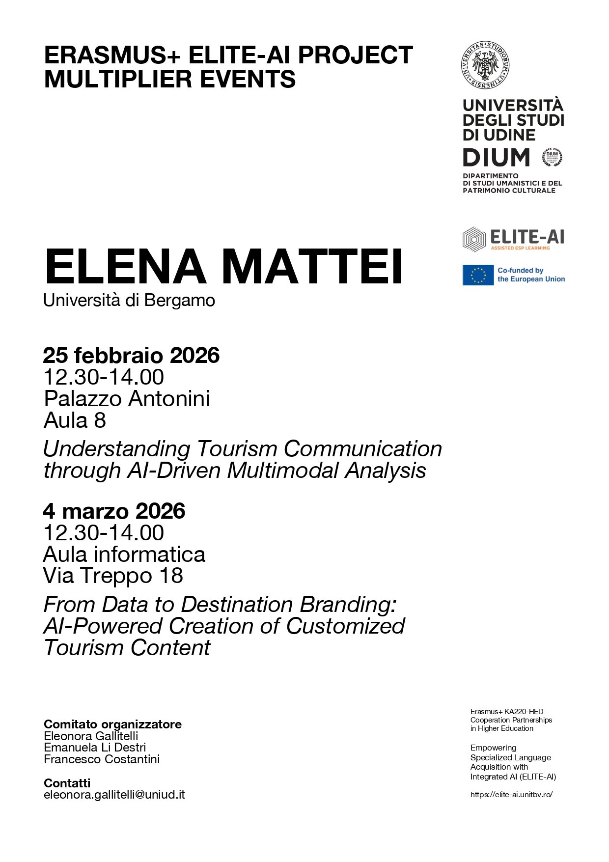 L’iniziativa fa parte del progetto ELITE-AI (Empowering Specialized Language Acquisition with Integrated AI) Erasmus+ KA220-HED, ed è organizzata da Francesco Costantini, Eleonora Gallitelli ed Emanuela Li Destri.