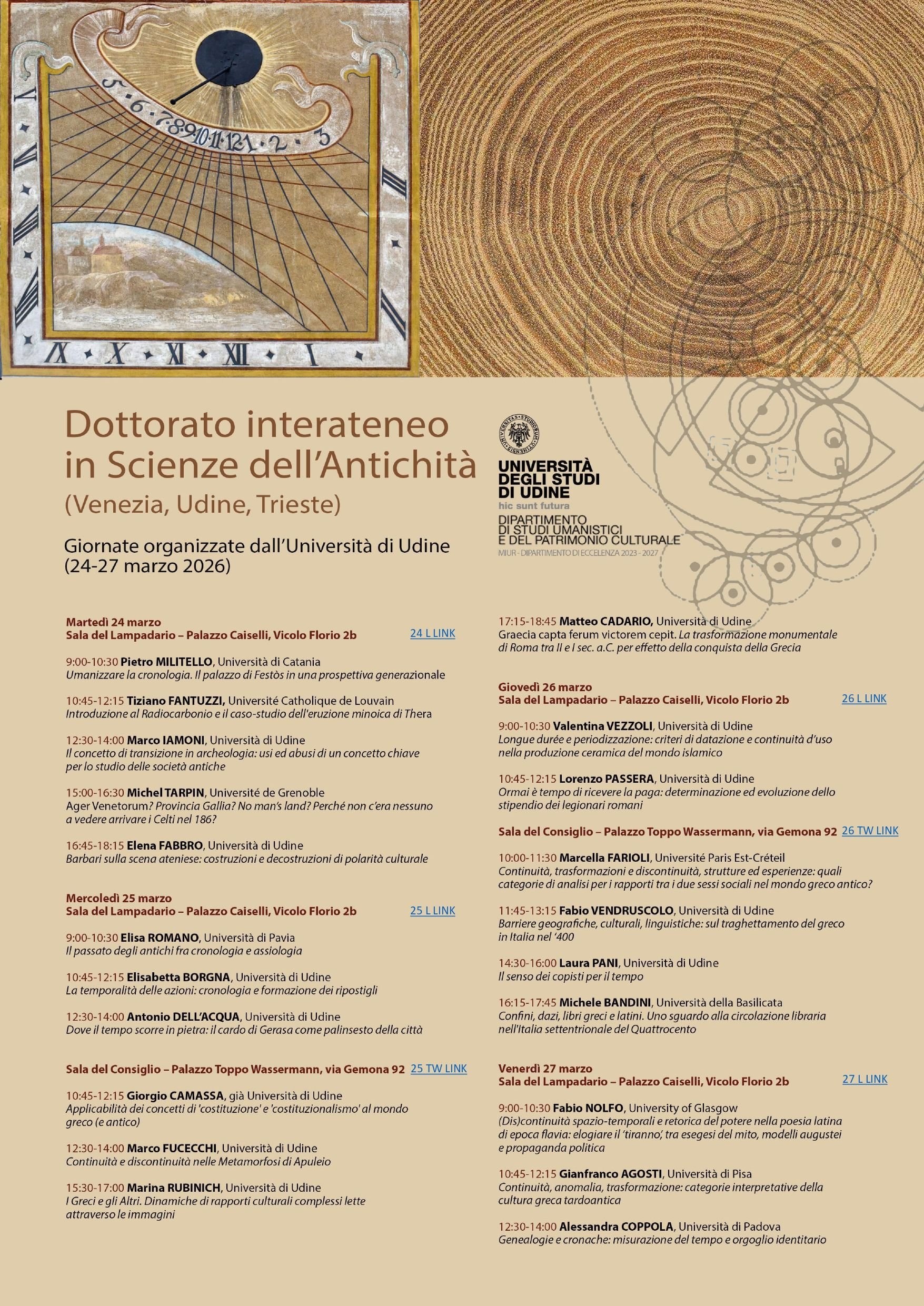 Dal 24 al 27 marzo 2026, nelle sedi di Palazzo Caiselli (Sala del Lampadario) e Palazzo di Toppo Wassermann (Sala del Consiglio) di Udine, si svolgerà la Settimana di didattica udinese nell'ambito del Dottorato interateneo in Scienze dell’Antichità (Venezia, Udine, Trieste).