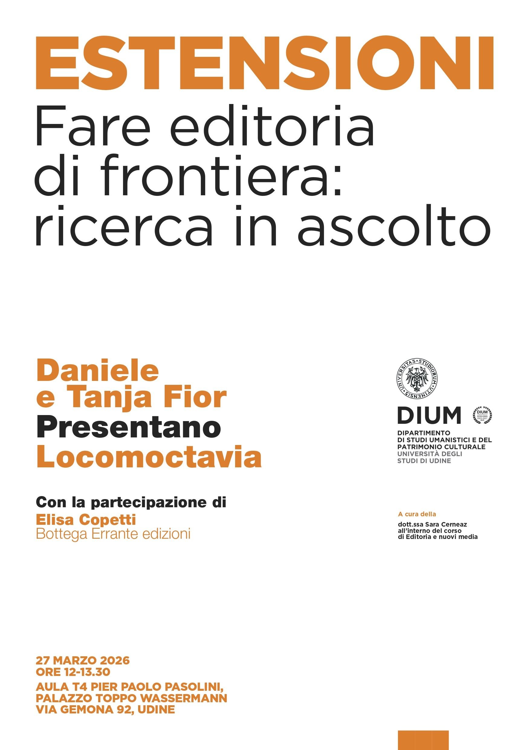 Venerdì 27 marzo 2026, alle ore 12.00, nell'Aula T4 Pier Paolo Pasolini di Palazzo Toppo Wassermann (Via Gemona, 92 - Udine) si terrà l’incontro di Estensioni. Fare editoria di frontiera: Ricerca in ascolto, con Daniele e Tanja Fior (Locomoctavia), e la partecipazione di Elisa Copetti (Bottega Errante edizioni).