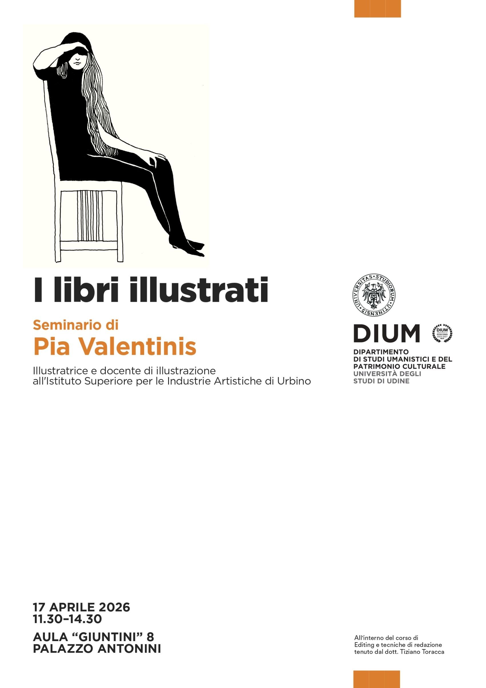 Venerdì 17 aprile 2026, alle ore 11.30, nell'Aula 8 di Palazzo Antonini-Cernazai (Via Petracco, 8 - Udine) si terrà il seminario-lezione sul tema: I libri illustrati, con Pia Valentinis (Illustratrice), organizzato nell’ambito del corso di Editing e tecniche di redazione di Tiziano Toracca.