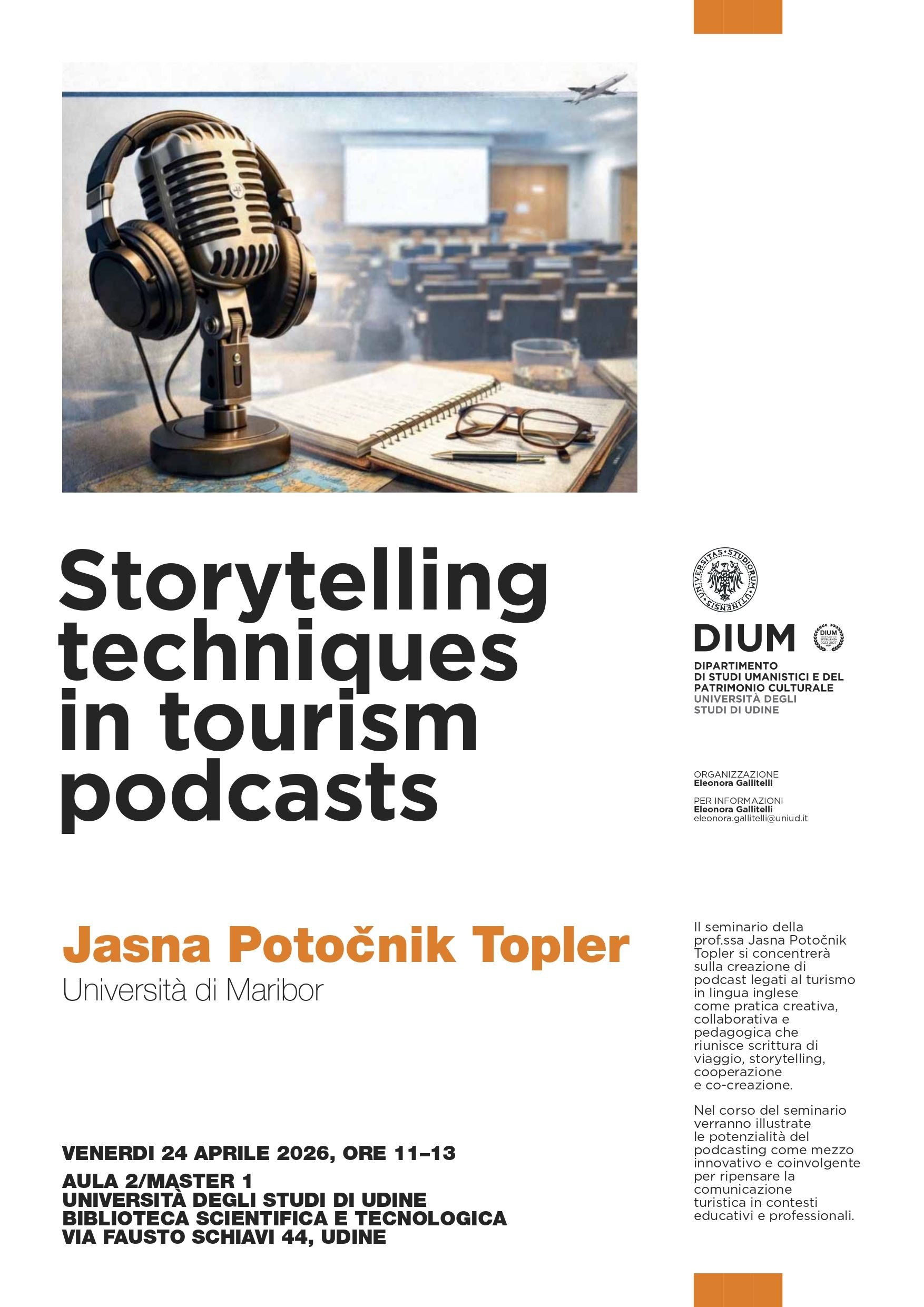 Venerdì 24 aprile 2026 presso la nuova biblioteca dei Rizzi a partire dalle ore 11.00 si svolgerà il seminario “Storytelling techniques in tourism podcasts”, tenuto dalla Prof.ssa Jasna Potočnik Topler dell’Università di Maribor.