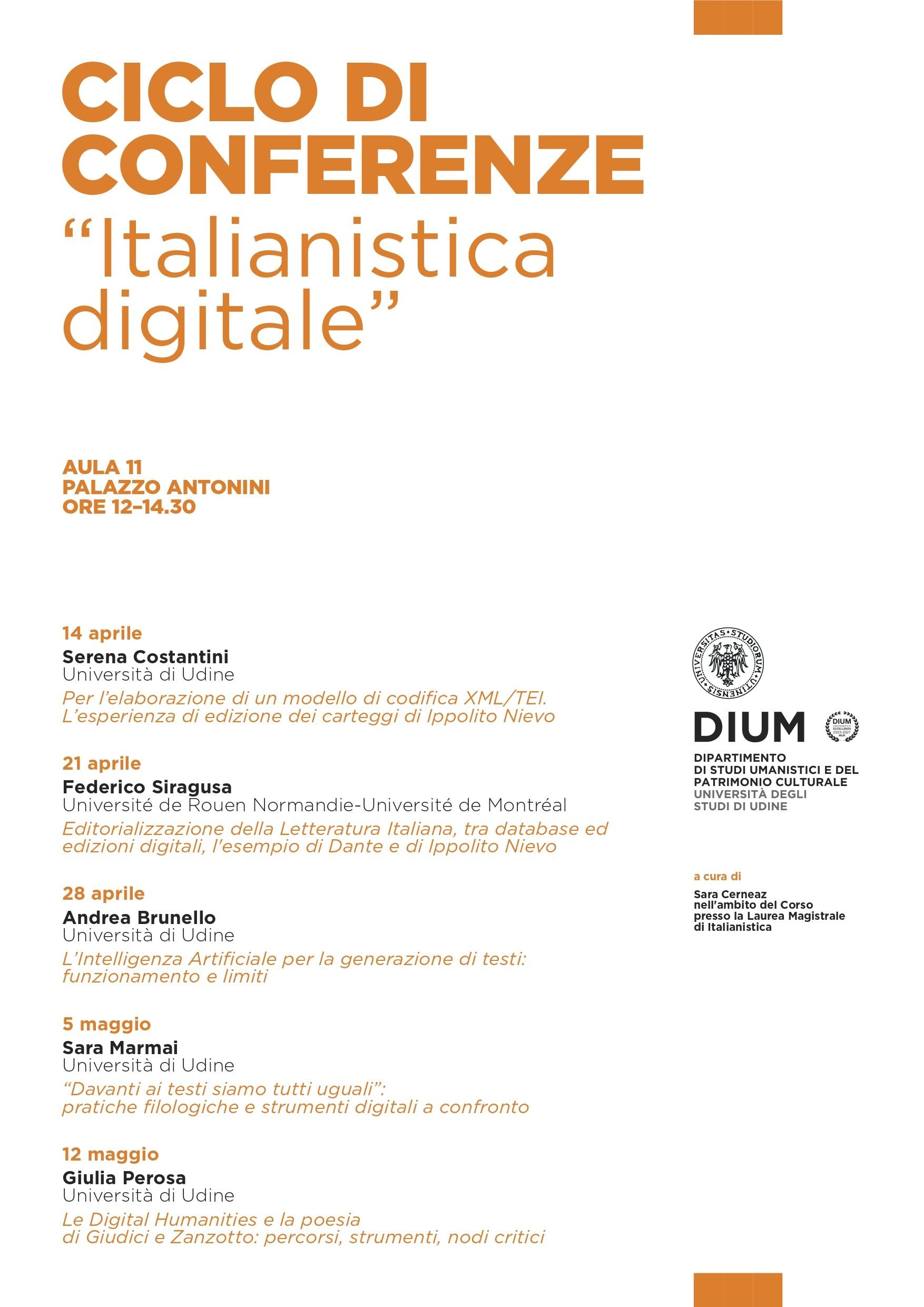 “ITALIANISTICA DIGITALE”. Ciclo di Conferenze a cura di Sara Cerneaz nell'ambito del Corso di Laurea Magistrale di Italianistica
