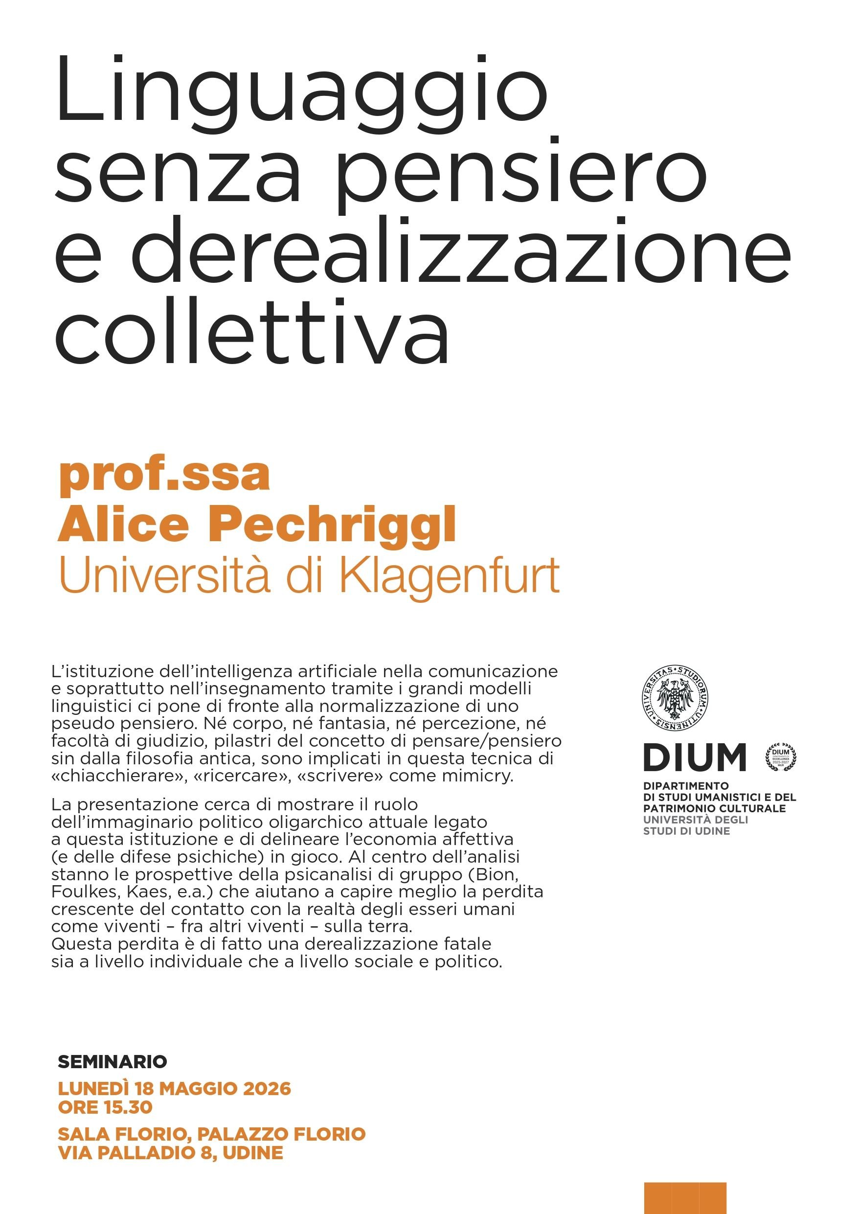 LINGUAGGIO SENZA PENSIERO E DEREALIZZAZIONE COLLETTIVA. Seminario della prof.ssa Alice Alice Pechriggl (Università di Klagenfurt)